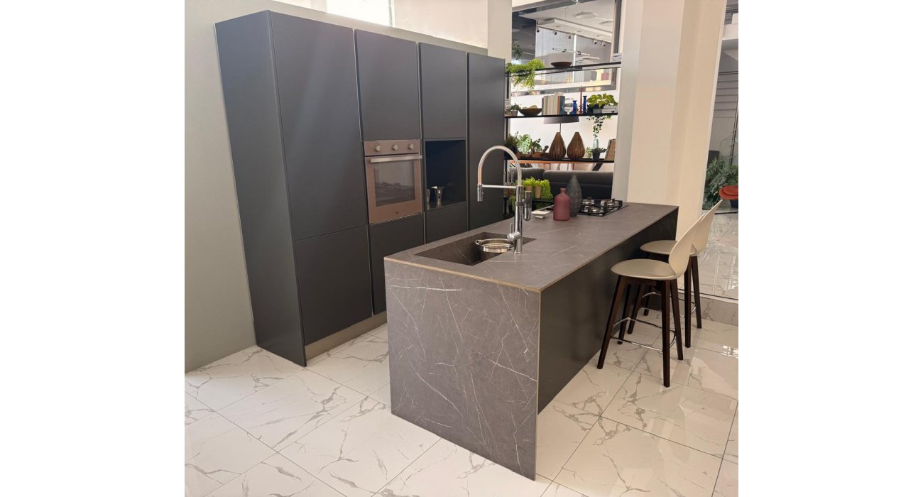 Εκθεσιακή κουζίνα σε προσφορά!Επώνυμη Ιταλική κουζίνα της STOSA CUCINE σε ένα πολύ ιδιαίτερο σκούρο καφέ χρώμα ματ λακας με σκληρό HPL μασίφ πάγκο 1,2εκ με πλαινά κατεβάσματα νησίδας και φτιαχτό custom νεροχύτη απο το ίδιο υλικό. Με αυλακιές αλουμινίου GOLA στο χαρακτηριστικό χρώμα της STOSA , Τιτάνιο.