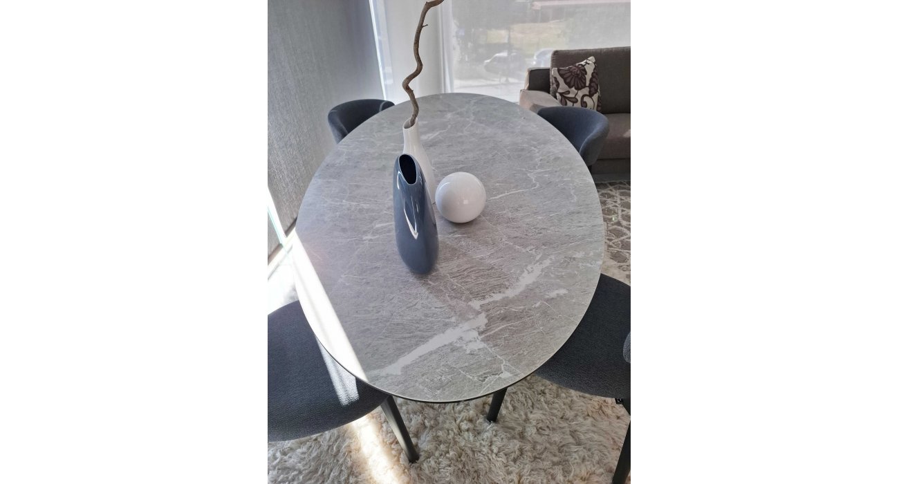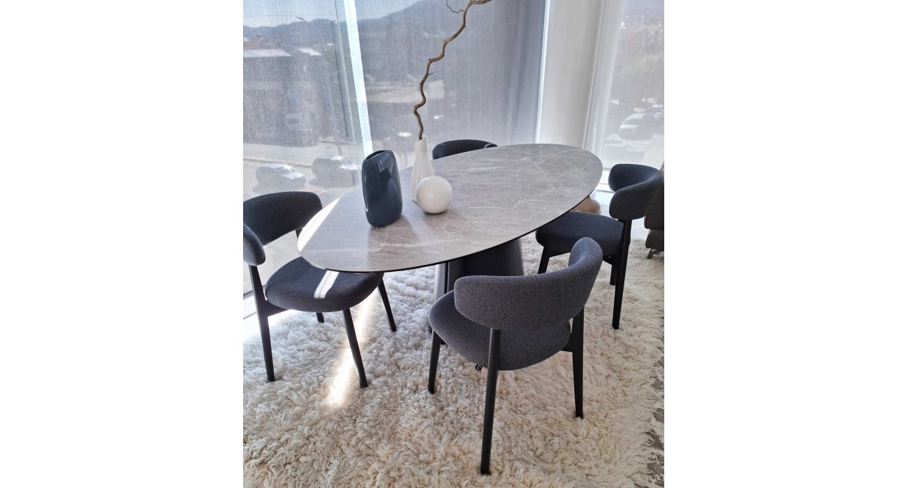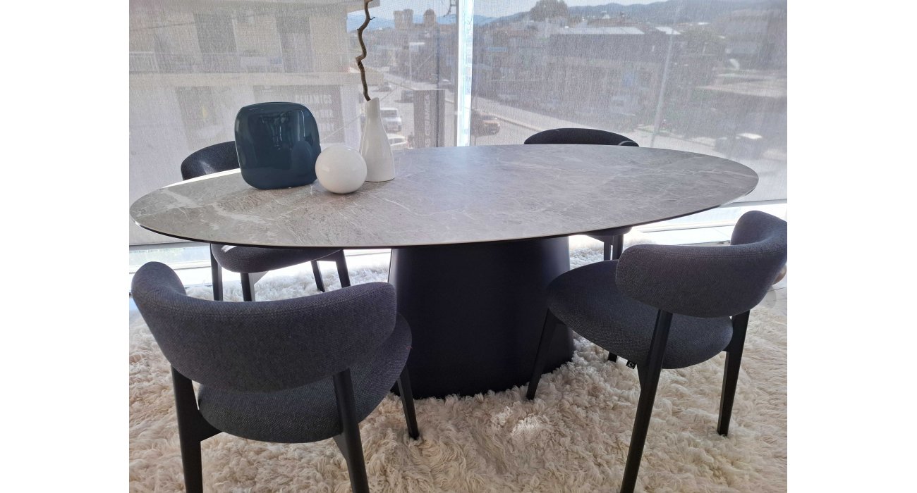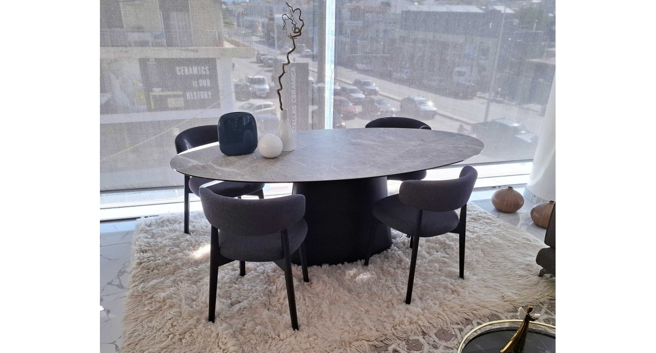 Σταθερό Τραπέζι Connubia, μοντέλο Ellisse με διαστάσεις 200εκ x 100εκ απο τον επώνυμο Ιταλικό Οίκο επίπλων Calligaris. Με κεραμική επιφάνεια γκρίζου μαρμάρου κολλημένη σε κενό αέρος με γυαλί στο κάτω μερος , με πολύ ιδιαίτερο οβάλ σχήμα για να χωράει σε κάθε χώρο και να μπορεί να φιλοξενεί άνετα 6/8 άτομα. Με βαριά μεταλλική μαύρη βάση, το τραπέζι ξεχωρίζει και δίνει χαρακτήρα στο σαλόνι κατευθείαν.